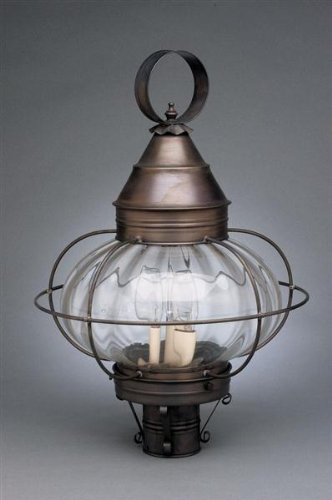 #Northeast Lantern 2573 This lighting fixture is hand made in New Hampshire from 100% brass or copper materials. Includes a lifetime guarantee, except for glass. UL Listed. The all natural finish that will not peel or flake off. Features: -Post Lantern. -Onion collection. -Available in multiple finishes. -Available with Clear, Clear Seedy, Frosted, Optic and Optic Seedy glass types. -Solid brass construction. -Carefully cut, soldered, finished and wired by hand. -Crafted with a detachable globe. -Mounting Area: 3" Diameter. -Made in the USA. -Manufacturer provides lifetime guarantee. Specifications: -Accommodates (1) 75W Medium base bulb. -Overall Dimensions: 22" H x 14.5" W x 14.5" D. Finish: Raw Copper, Glass Type: Clear Seedy